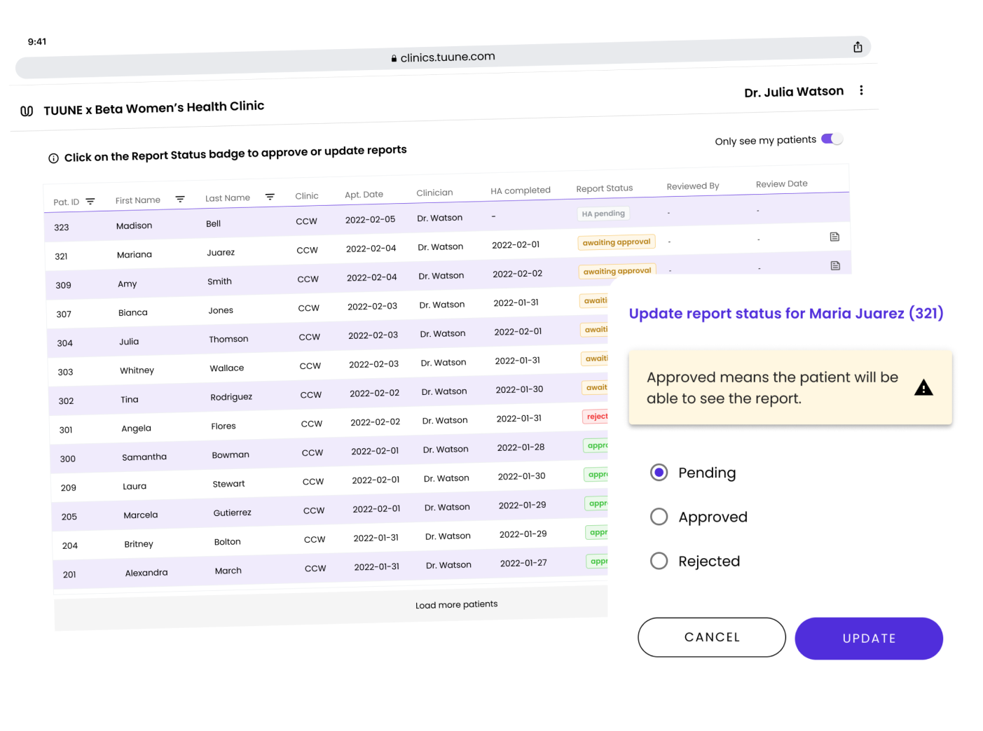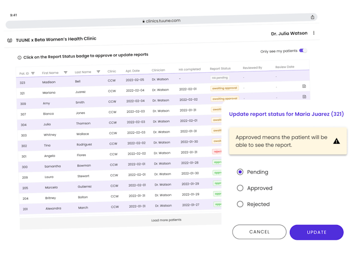 See a detailed clinical report with MEC eligibility, health history, and symptoms/conditions before unlocking it for your patients. Patients are notified as soon as their reports are approved so they can review it and prepare any questions in advance.
