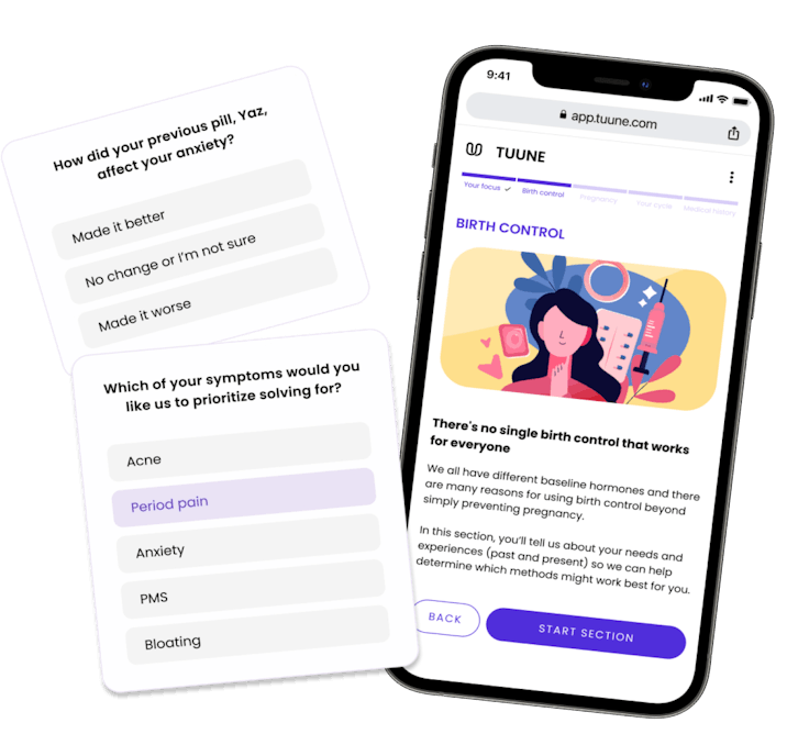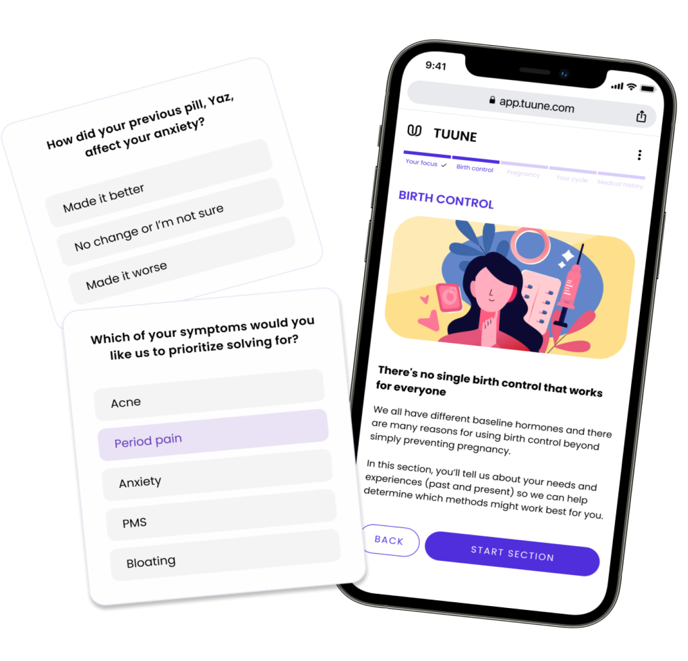 Tuune is an evidence-based decision aid that identifies hormone-related symptoms/conditions and recommends the best birth control options, personalized to each patient.